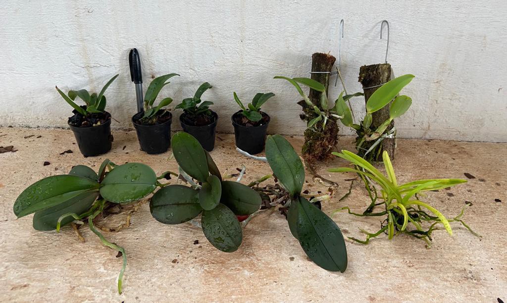 3 mudas de phalaeonopsis sem identificação, de cores variadas, fora do vaso;